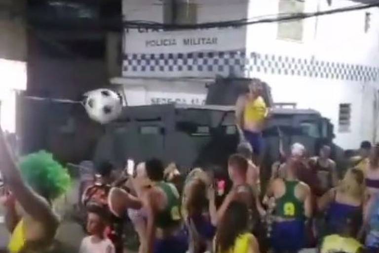 Em vídeo que circula nas redes sociais, um dos foliões do bloco -fantasiado com bermuda azul, blusa amarela e meião de futebol– se apoia na lateral do veículo blindado com uma mão, enquanto segura uma latinha com a outra. Na imagens ainda é possível ver que o “caveirão” está parado em frente ao posto da da PM no Morro do Barbante e há uma viatura ao lado.