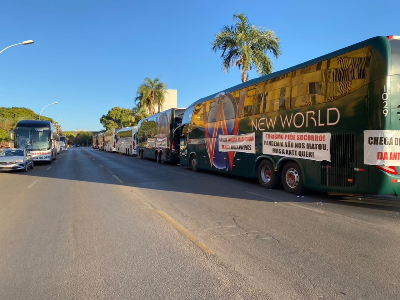 Nesta quarta-feira, 08, fretadores de ônibus, representando cerca de 8 mil empresas registradas na Agência Nacional de Transportes Terrestres (ANTT), se manifestam em frente à Câmara dos Deputados.
