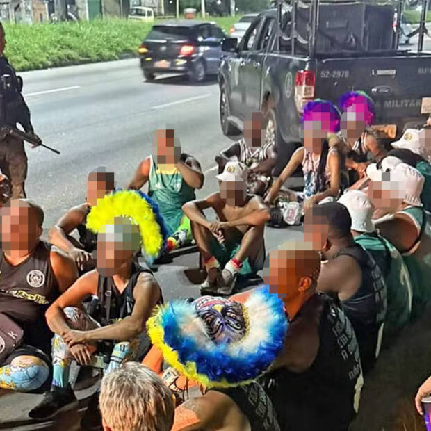 Policiais militares do Rio prenderam um grupo com 61 pessoas fantasiados de bate-bolas na noite desta segunda-feira (16) na avenida Brasil, no Rio de Janeiro, quando se dirigiam para o Complexo da Penha, na zona norte.