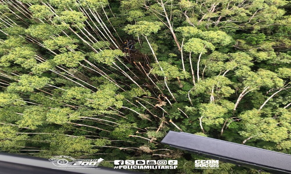 Imagem divulgada pela Polícia Militar mostra destroços do helicóptero em meio a vegetação fechada. Não há ainda informações a respeito de sobreviventes.