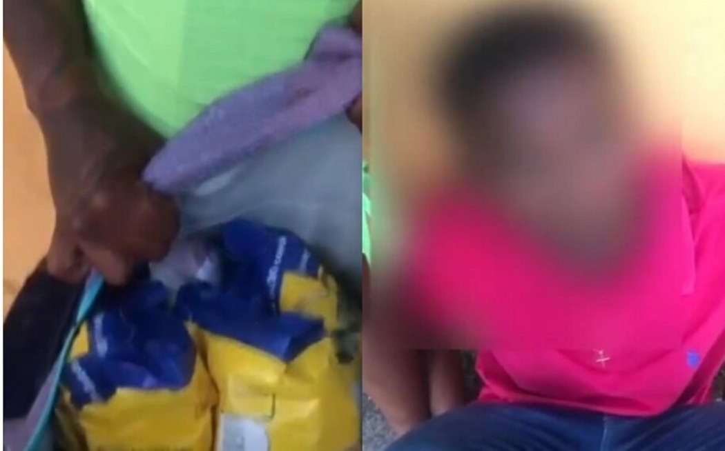 O vídeo divulgado nas redes sociais mostra uma mulher com a mochila aberta e alguns sacos de leite em pó. É possível ouvir “ai, ai” enquanto um homem questiona a mulher sobre o nome da mãe dela. Ela responde.