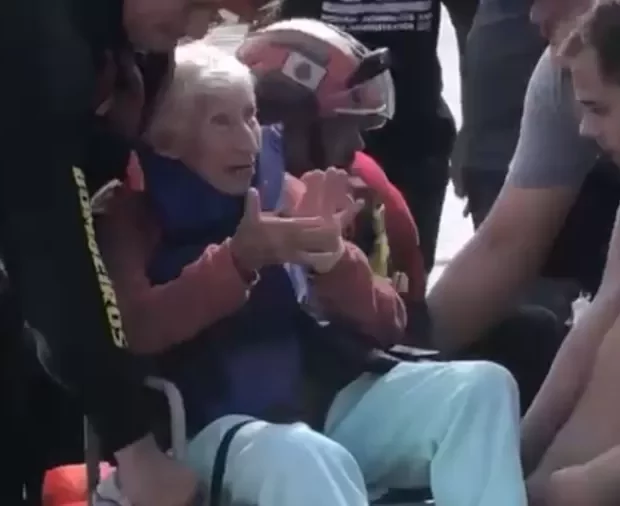 Os bombeiros passavam a idosa da varanda da residência para um bote. Vídeo mostrou militares tirando a idosa com cuidado e brincando com ela. Nas imagens, é possível ver o alagamento em torno do local, e observar que outras pessoas esperavam para também serem resgatadas.