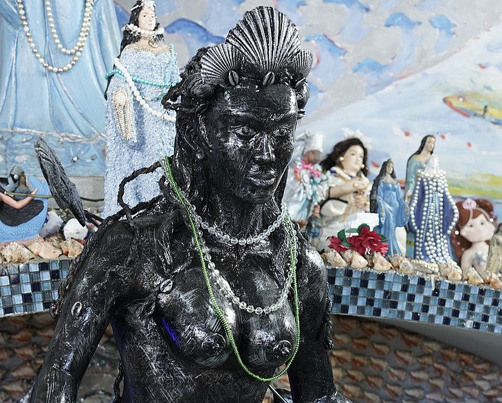 Uma estrutura de metal deu a sustentação e a fibra de vidro moldou a divindade, metade peixe, metade mulher. O acabamento foi feito com tinta, pó de mármore, búzios e conchas, cristalizando a figura de Iemanjá. Uma Iemanjá preta.