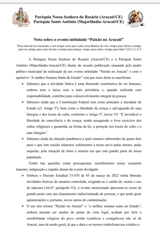 A nota publicada argumentou a situação da pandemia no município e considerou que as expressões “Paixão no Aracati” e “A melhor Semana Santa do Estado” feriam a sensibilidade religiosa dos cristãos.