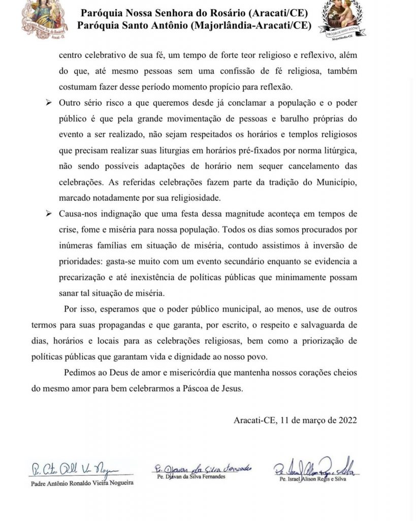 A Paróquia Nossa Senhora do Rosário (Aracati/CE) e a Paróquia Santo Antônio (Majorândia – Aracati/CE) publicou uma nota de repúdio nesta sexta-feira (11). A indignação veio a partir da realização de um evento, com recursos municipais disponibilizado pelo prefeito Bismarck Costa Lima, chamado “Paixão no Aracati”.