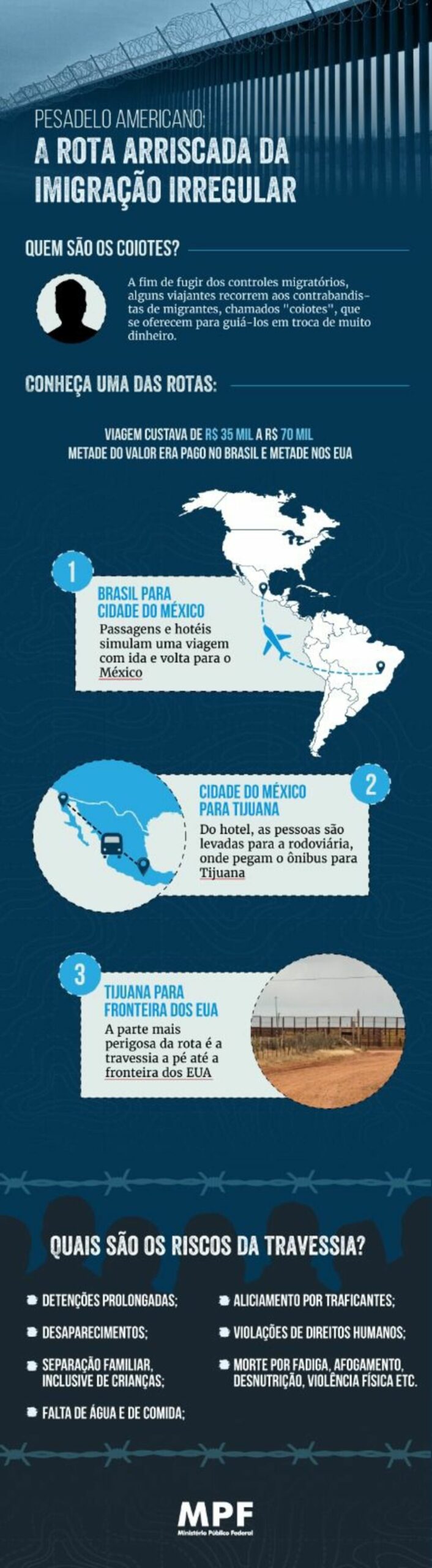O Ministério Público Federal (MPF) denunciou à Justiça Federal oito pessoas por transportar ilegalmente brasileiros aos Estados Unidos (EUA). Elas também irão responder por lavagem de dinheiro, em valores que ultrapassam R$16 milhões, e por organização criminosa. Segundo a denúncia, de 2019 até 2022, a organização foi responsável pela entrada de, pelo menos, 444 pessoas ilegalmente no país estrangeiro, sendo que quase um terço delas era menor à época da viagem.
