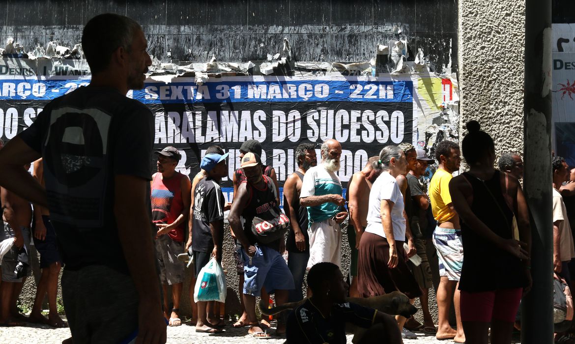 de Janeiro. Dezenas de pessoas, sentadas ou deitadas na calçada, protegidas por árvores e um abrigo de ônibus, correm para formar uma fila quando veem voluntários saírem do número 50.