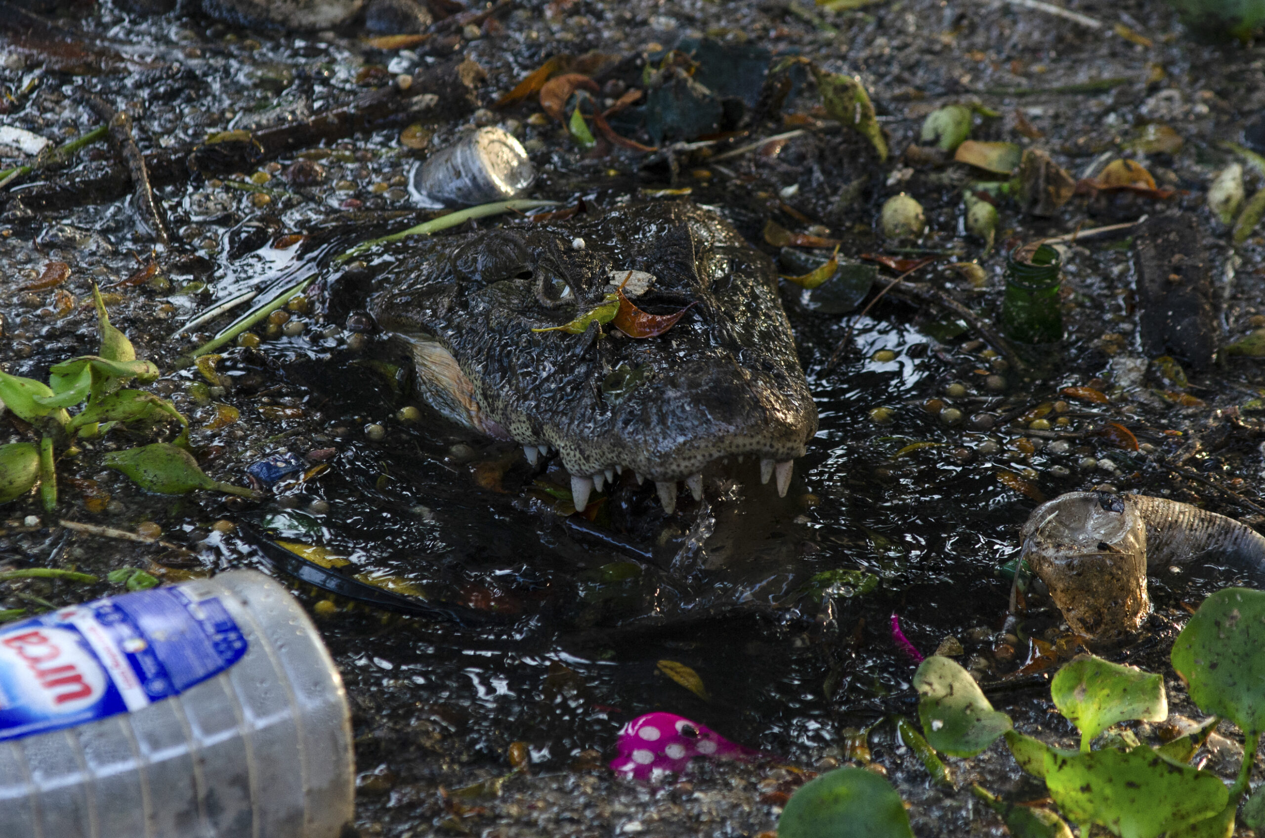 Perto de uma ponte na comunidade do Terreirão, a poucos quilômetros da lagoa, é possível ver o focinho de um deles, emergindo em meio ao lixo.