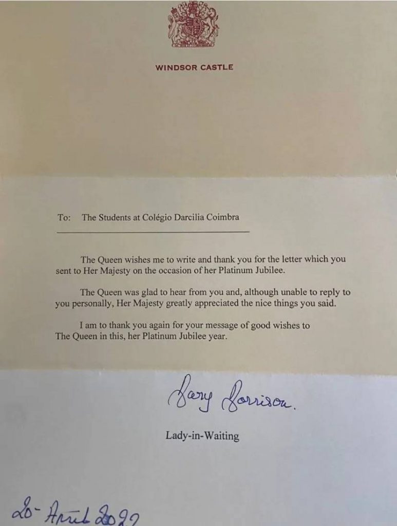 No 1º ano do ensino médio, os alunos do Colégio Darcília Coimbra, no município de João Pinheiro (MG), ficaram eufóricos ao receber uma carta vinda diretamente do Palácio de Buckingham, na Inglaterra, assinada em nome da rainha Elizabeth II. A correspondência foi uma resposta à carta mandada pelos alunos como forma de parabenizá-la pelos seus 70 anos de reinado (Jubileu de Platina) e desejando que a monarca se recuperasse da Covid-19 –à época, ela estava contaminada.
