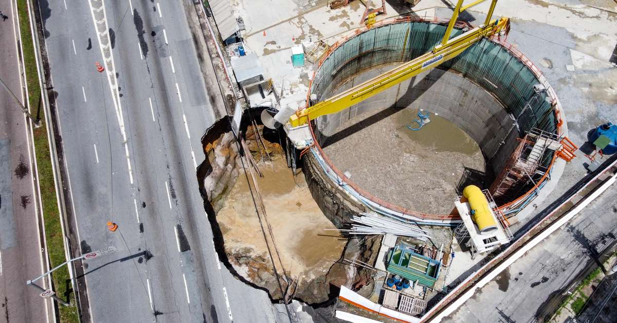 Na terça, a cratera se abriu ao lado de um poço da obra do metrô, após o rompimento da tubulação de esgoto, quando o tatuzão, equipamento responsável pela escavação dos túneis do metrô, passava cerca de três metros abaixo.