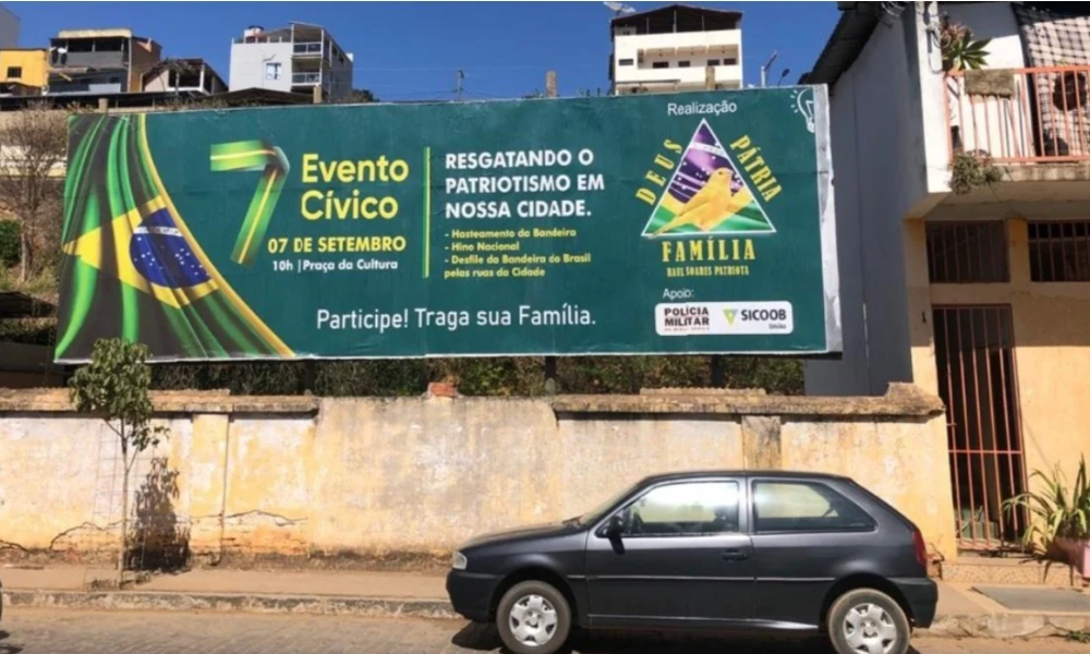 O outdoor foi instalado por um grupo local da cidade de 23.762 habitantes, o Raul Soares Patriota, que tem como lema “Deus, Pátria e Família”. “Resgatando o patriotismo em nossa cidade. Participe! Traga a sua família”, diz a peça publicitária.