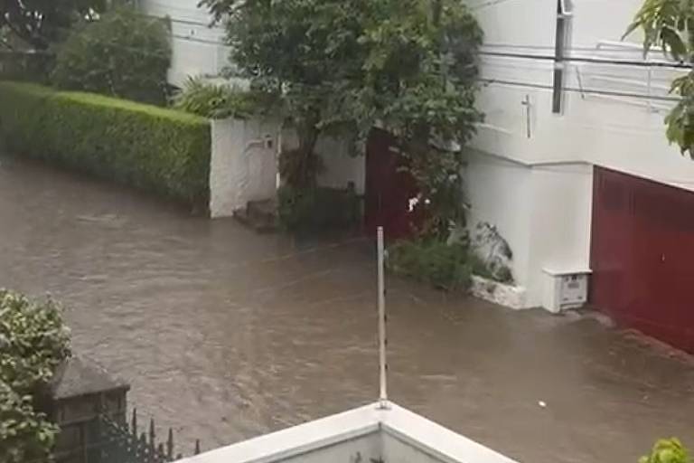 Até às 11h15, o CGE não havia identificado nenhum ponto de alagamento na cidade, mas imagem mostra enchente e correnteza na rua Santa Cristina, no Jardim Paulistano, zona oeste de São Paulo.