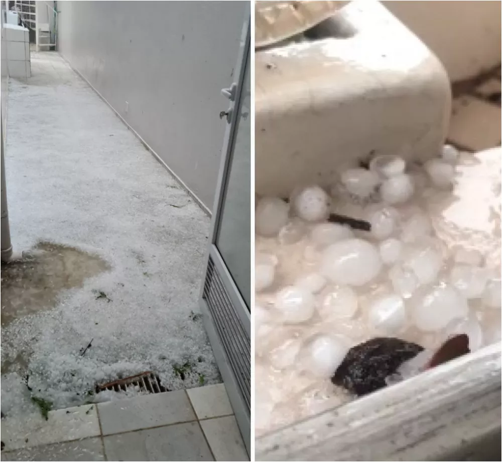 Em uma das imagens, um morador mostra o acúmulo de pedras de gelo nas telhas do vizinho em menos de cinco minutos.