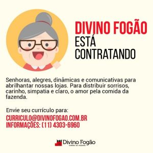 O Divino Fogão, que acaba de comemorar 37 anos, está contratando pessoas da terceira idade para integrar as equipes das lojas. Com o objetivo de deixar o atendimento mais humanizado, a rede abre as portas para receber senhores e senhoras para atuarem como recepcionistas. Chamados carinhosamente de Dona Divina e Seu Divino, eles são os responsáveis por mostrar todo o encanto das raízes caipiras e da comida da fazenda do Divino Fogão aos clientes.