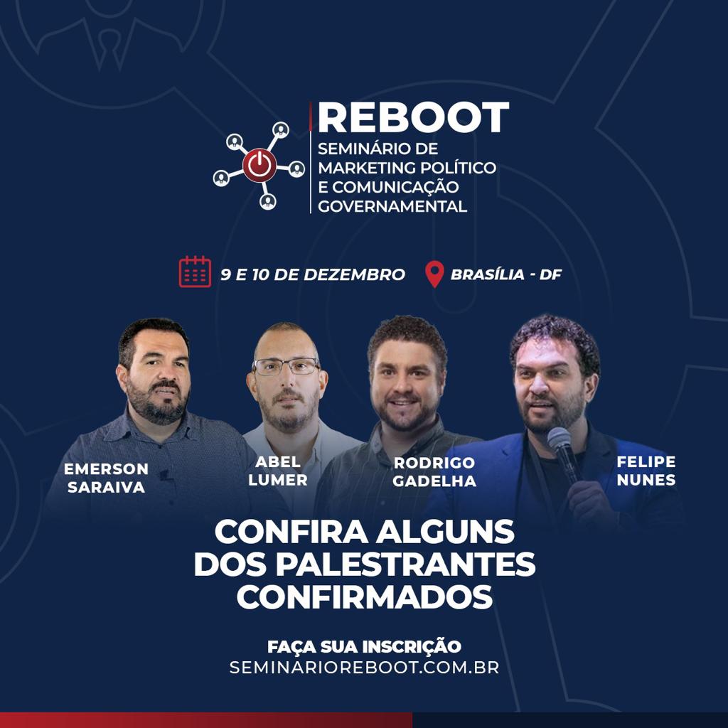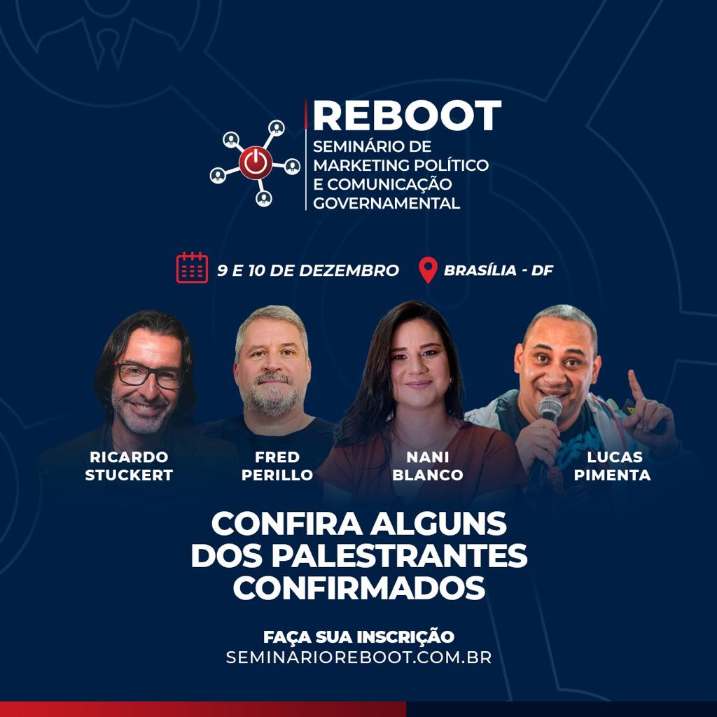 Brasília será palco da segunda edição do Seminário Reboot, um evento dedicado a “reiniciar” e aprimorar o conhecimento em marketing político e comunicação governamental. O encontro ocorre nos dias 9 e 10 de dezembro no auditório do Edifício ION (601 Norte) e oferece uma imersão com grandes nomes da comunicação, como o fotógrafo Ricardo Stuckert, o professor do RenovaBR, Rodrigo Gadelha, o especialista em marketing político e eleitoral, Lucas Pimenta, entre outros.