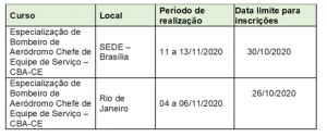 A Universidade Infraero está com inscrições abertas para o curso de “Especialização de Bombeiro de Aeródromo Chefe de Equipe de Serviço (CBA-CE)”. Com duração de 24 horas/aula distribuídas entre teoria e prática, o treinamento será oferecido presencialmente nas cidades de Brasília (DF) e Rio de Janeiro (RJ).