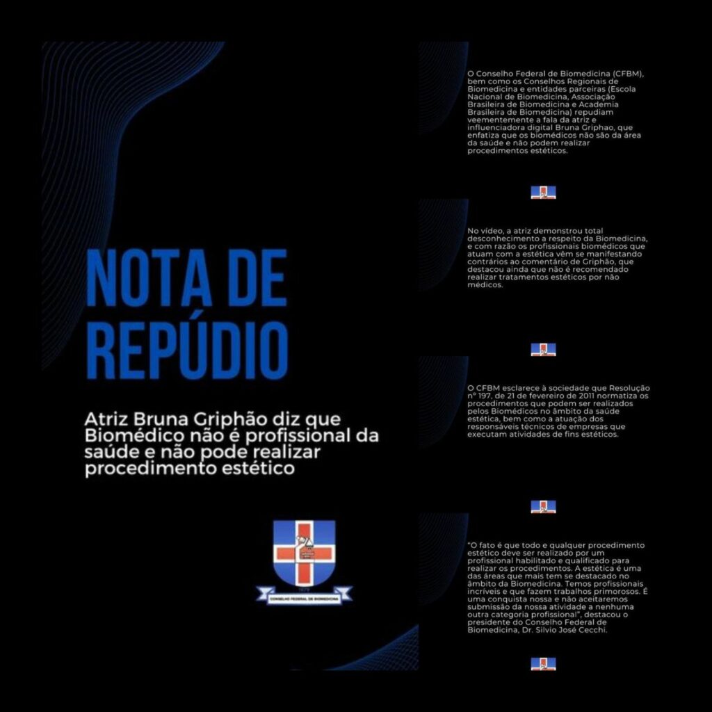 “O Conselho Federal de Biomedicina (CFBM), bem como os Conselhos Regionais de Biomedicina e entidades parceiras (Escola Nacional de Biomedicina, Associação Brasileira de Biomedicina e Academia Brasileira de Biomedicina) repudiam veementemente a fala da atriz e influenciadora digital Bruna Griphao, que enfatiza que os biomédicos não são da área da saúde e não podem realizar procedimentos estéticos”, iniciou a nota.