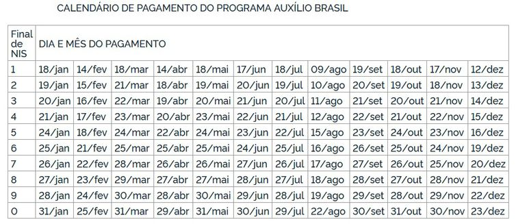 Em janeiro, o valor mínimo do Auxílio Brasil voltará a R$ 400, a menos que nova proposta de emenda à Constituição seja aprovada. Tradicionalmente, as datas do Auxílio Brasil seguem o modelo do Bolsa Família, que pagava nos dez últimos dias úteis do mês. No entanto, portaria editada no início de agosto antecipou o pagamento da parcela deste mês para o período de 9 a 22.