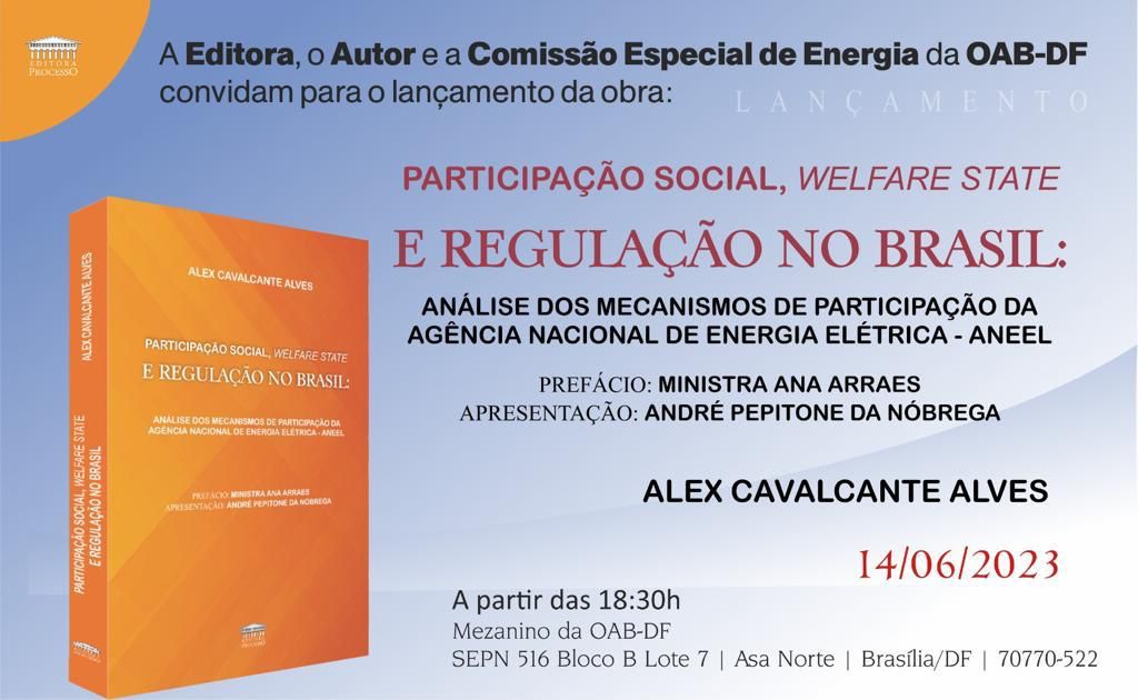 Na próxima semana, na quarta-feira (14), o novo livro de Alex Cavalcante Alves terá uma cerimônia de lançamento no Mezanino da OAB-DF. A apresentação será feita pelo ex-Diretor-Geral da ANEEL, André Pepitone de Nóbrega, com prefácio da Ministra Ana Arraes, ex-presidente do Tribunal das Contas da União (TCU).