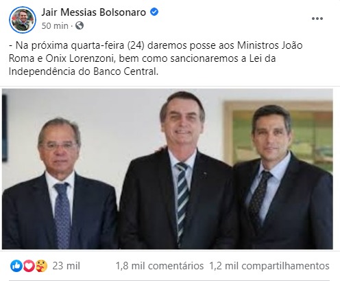 Na postagem de Bolsonaro, anunciou que na mesma data será sancionada a Lei de independência do Banco Central, em uma foto posada ao lado do ministro da Economia, Paulo Guedes, e do presidente do BC, Roberto Campos Neto.
