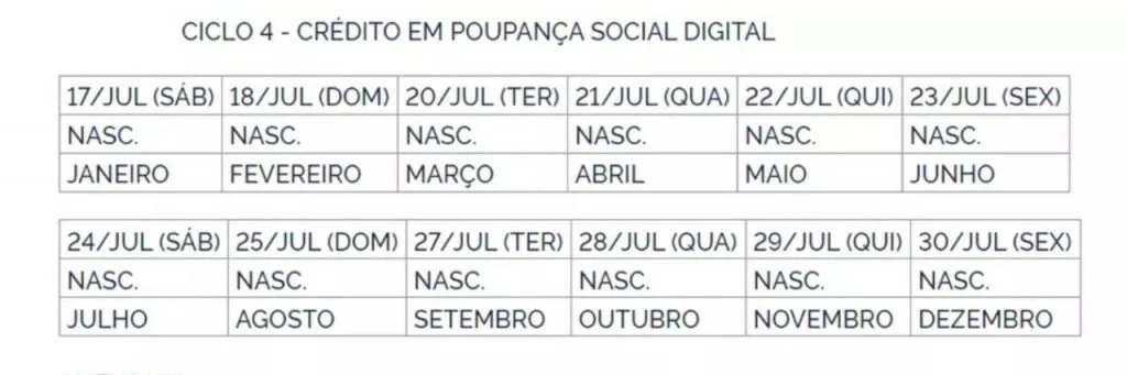 O cronograma atualizado foi divulgado no Diário Oficial da União (DOU) desta quinta-feira (15). Como de costume, primeiramente o benefício é depositado em conta-poupança social digital. O primeiro grupo, que receberá o crédito em 17 de julho, é composto por pessoas nascidas em janeiro. Os depósitos seguem até o dia 30 de julho.