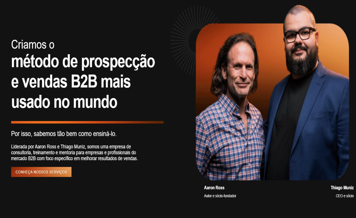 Aaron Ross, um renomado nome no mercado, é casado e pai de 10 filhos e, graças à sua metodologia juntamente com Thiago Muniz, CEO e Sócio, tem ajudado inúmeras empresas a melhorar os seus resultados de vendas no mercado B2B. Os fundamentos da Receita Previsível, como Cold Call 2.0 e a segmentação de funções na equipe de vendas, transformaram como as organizações abordam seu processo de vendas.