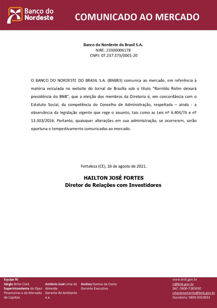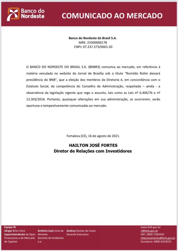 Após a publicação desta matéria, a assessoria do BNB entrou em contato com a reportagem e afirmou que; “o Comunicado ao Mercado, citado na matéria, limita-se a informar que as mudanças de gestão no Banco ocorrem sob a égide da legislação e, quando ocorrem, são imediatamente comunicadas ao mercado, não fazendo referências a indicações.”