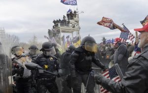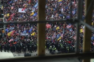 - US Capitol police officers try to stop supporters of US President Donald Trump to enter the Capitol on January 6, 2021, in Washington, DC. – Demonstrators breeched security and entered the Capitol as Congress debated the a 2020 presidential election Electoral Vote Certification. (Photo by Saul LOEB / AFP)