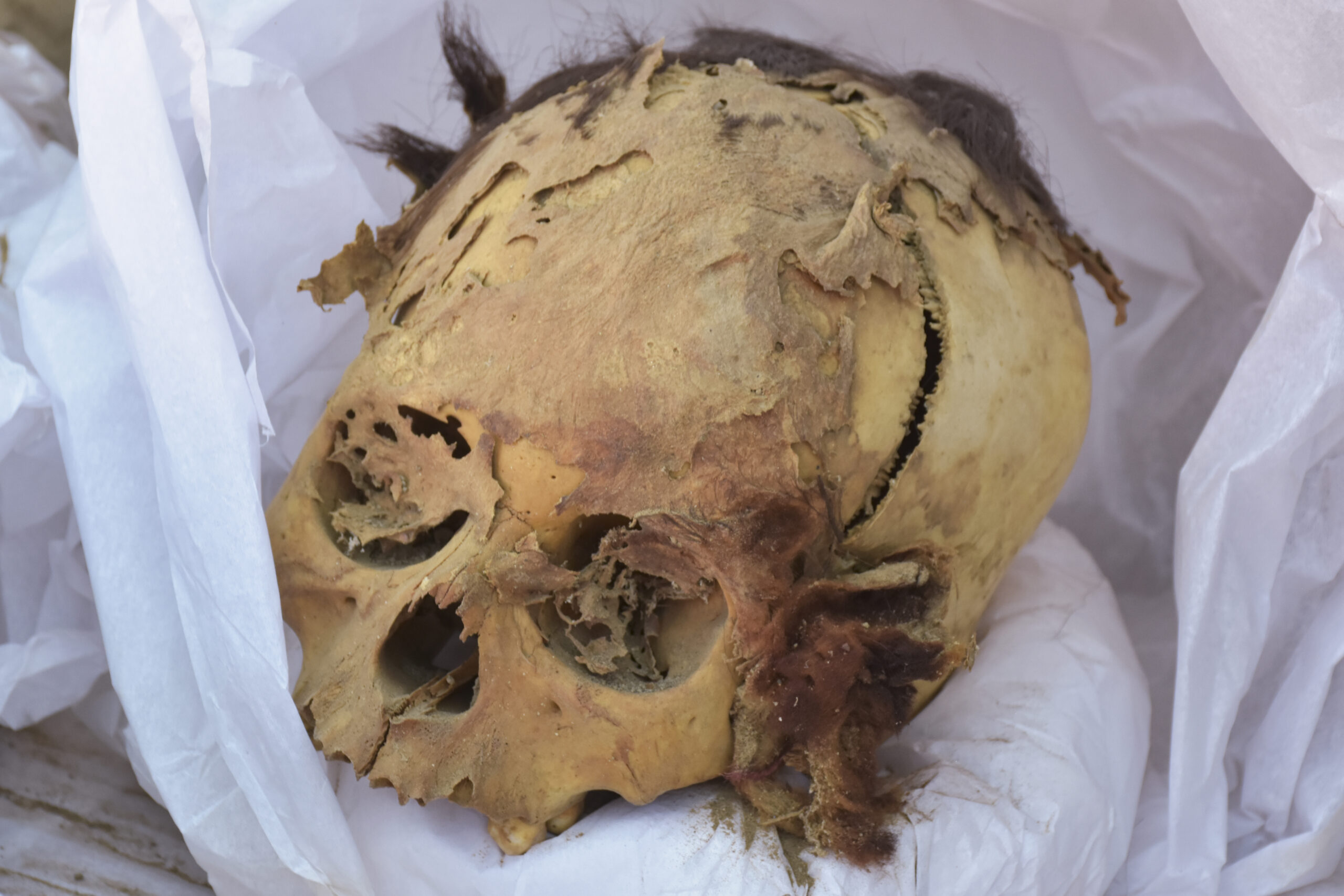 Antes de descobrir a múmia por inteiro, estudantes da Univerdade de San Marco e pesquisadores encontraram restos de cabelo e o crânio dela em um pacote de algodão durante a escavação.