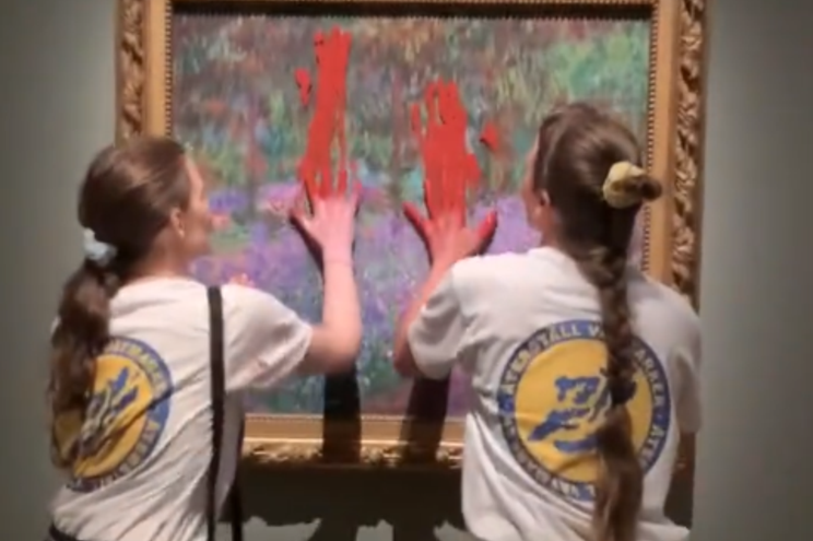 Dois ativistas ambientais intensificaram a tinta vermelha, nesta quarta-feira (14), sobre o vidro que protegeu uma pintura de Claude Monet no Museu Nacional de Estocolmo e depois pressionaram as mãos contra o vidro, segundo a polícia.