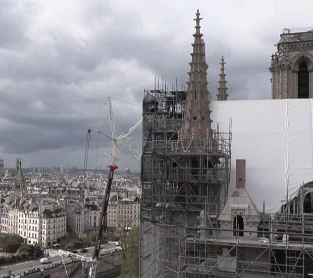 A agulha projetada pelo arquiteto Viollet-le-Duc, do século XIX, que desabou junto com parte do teto, voltou a ser visível em fevereiro.