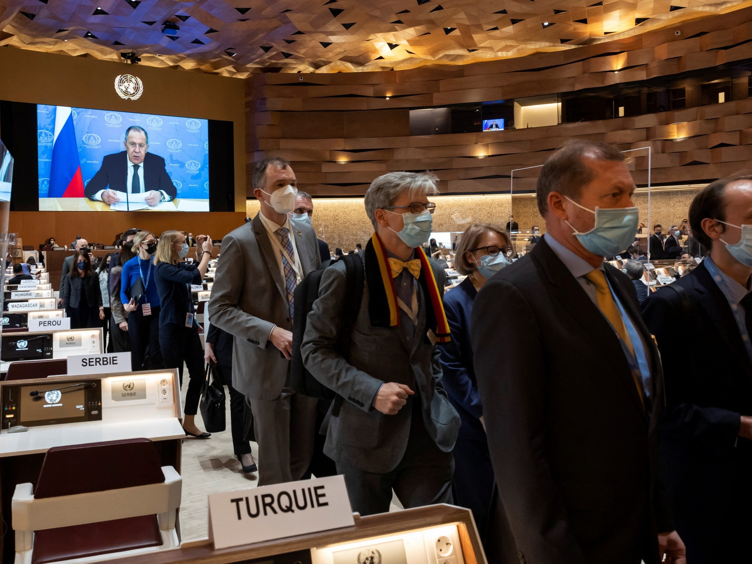A plenária da Conferência de Desarmamento ficou quase vazia após mais de cem diplomatas de 40 países ocidentais e aliados se retiraram da sala. Menos de uma hora depois, no Conselho de Direitos Humanos, a cena se repetiu, e os diplomatas que realizaram o protesto se reuniram com uma bandeira da Ucrânia.