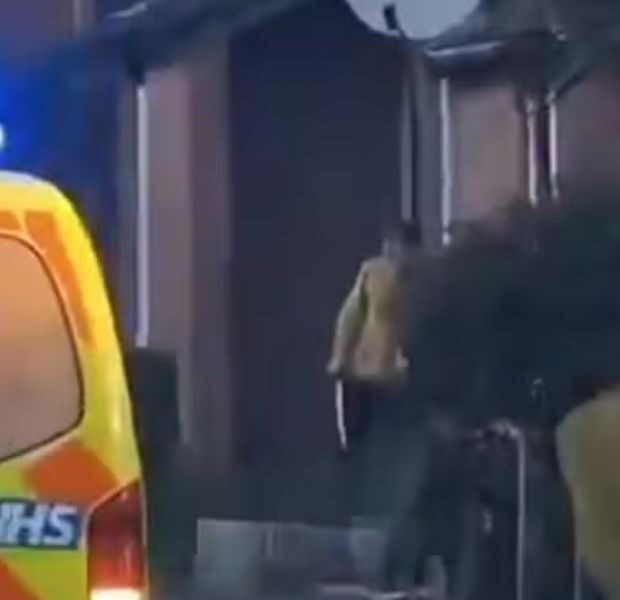 Imagens publicadas nas redes sociais e recolhidas pela mídia britânica mostravam um homem branco, vestindo calça preta e um moletom amarelo com capuz, espada na mão, andando de forma irregular em frente às casas, enquanto carros da polícia cercavam o local.