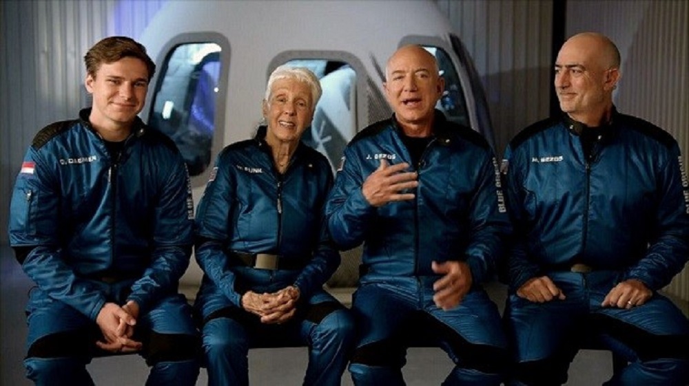 O foguete New Shepard foi lançado com quatro passageiros: Jeff Bezos, o irmão Mark Bezos, Wally Funk (pioneira do setor aeroespacial de 82 anos) e Oliver Daemen (estudante de física de 18 anos). Foram cerca de 10 minutos de viagem, que teve três etapas: o lançamento do foguete, a separação da cápsula com os passageiros e o retorno da tripulação à Terra em queda livre com paraquedas em direção à mesma região de onde partiu. Faltando 45 minutos para o lançamento, a equipe seguiu em direção rumo ao foguete para o embarque, o que inclui um trajeto de duas milhas de carro e a subida na estação de embarque.