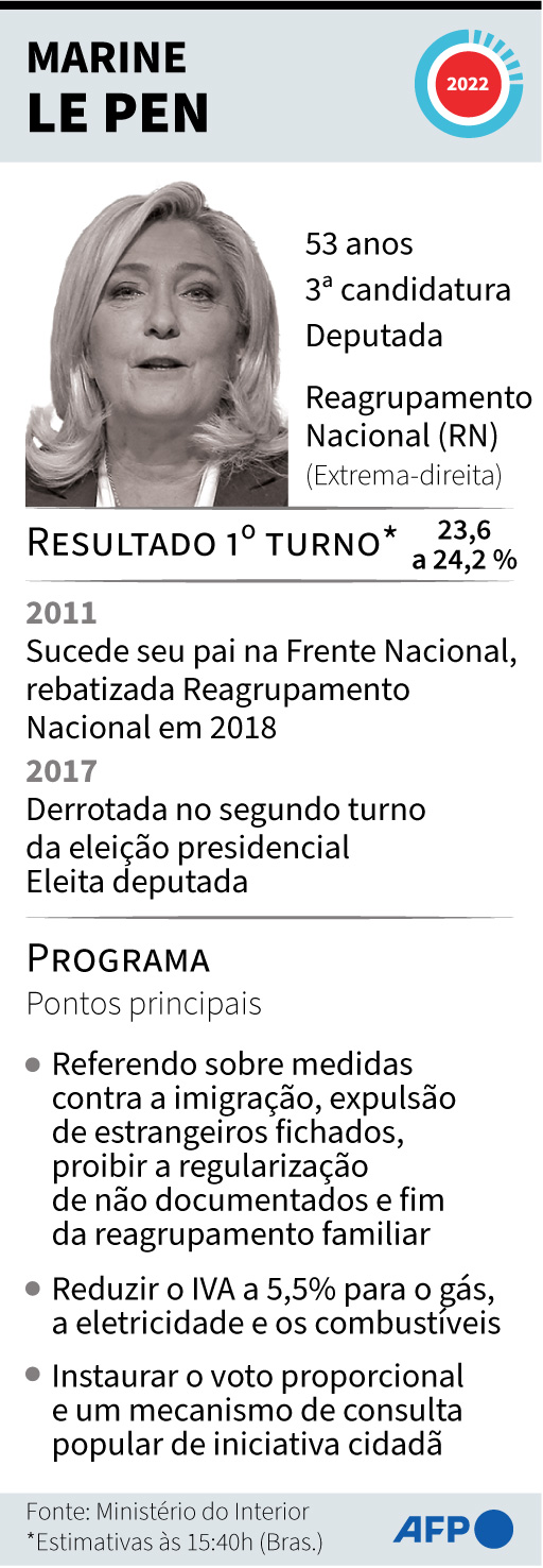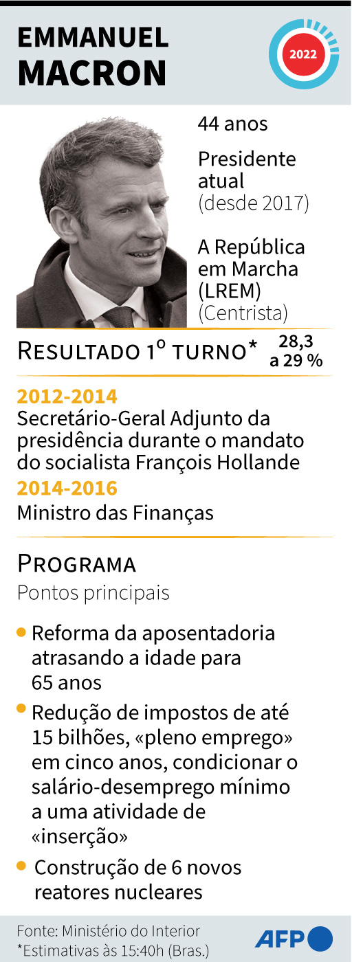 Macron, no poder desde 2017, tinha entre 27,6% e 29,7% dos votos, seguido de Le Pen, com 23,5% a 24,7%, segundo as primeiras estimativas. O esquerdista Jean-Luc Mélénchon (19,8% a 20,8%), o terceiro mais votado, ficou de fora do segundo turno, que será realizado em 24 de abril.
