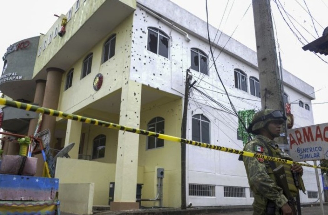 A fachada do palácio municipal de San Miguel Totolapan ficou com dezenas de marcas de tiros.