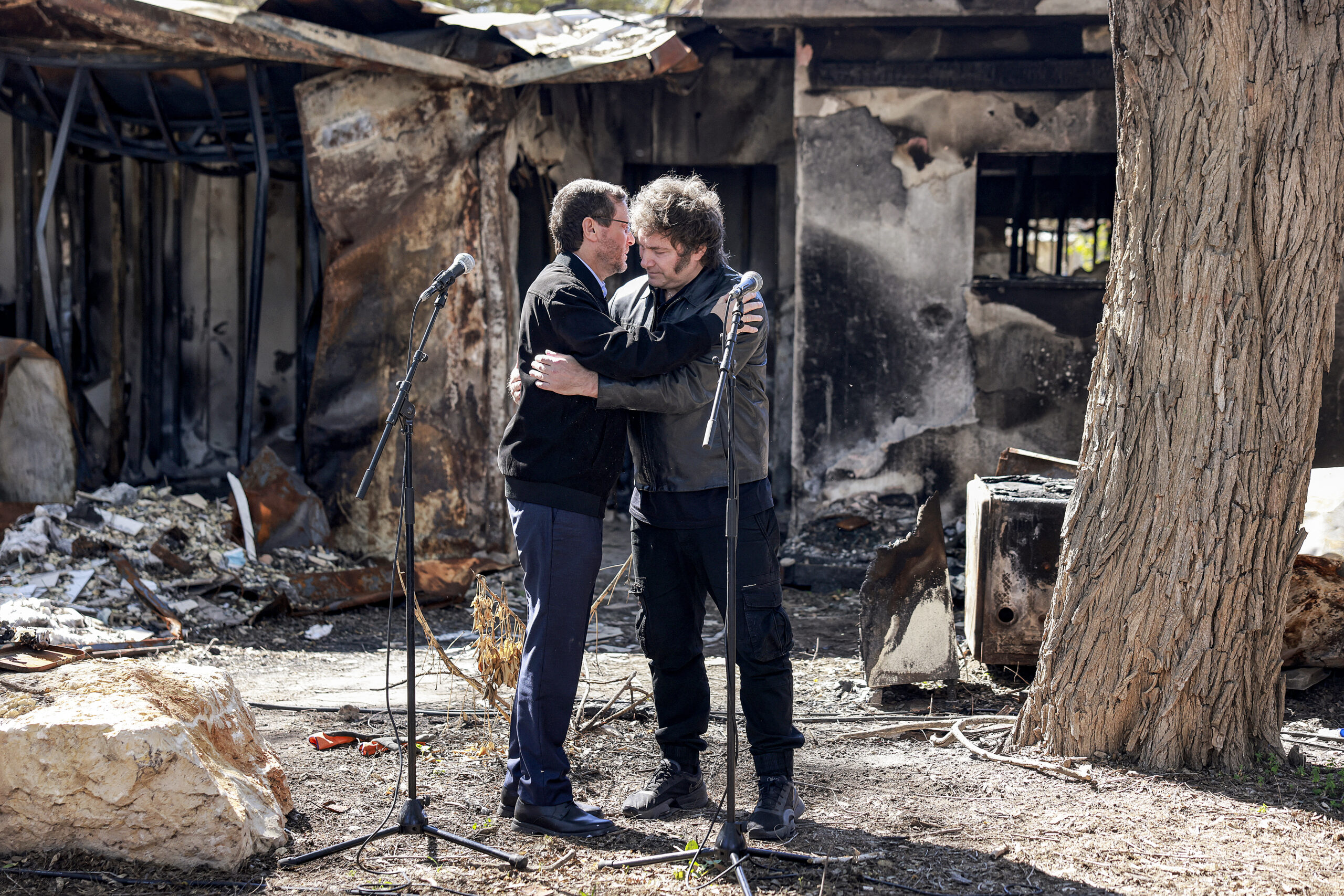 Ver o que resta do kibutz “me sacode a alma” e é “uma experiência muito, muito forte”, disse Milei em frente a uma casa incendiada.