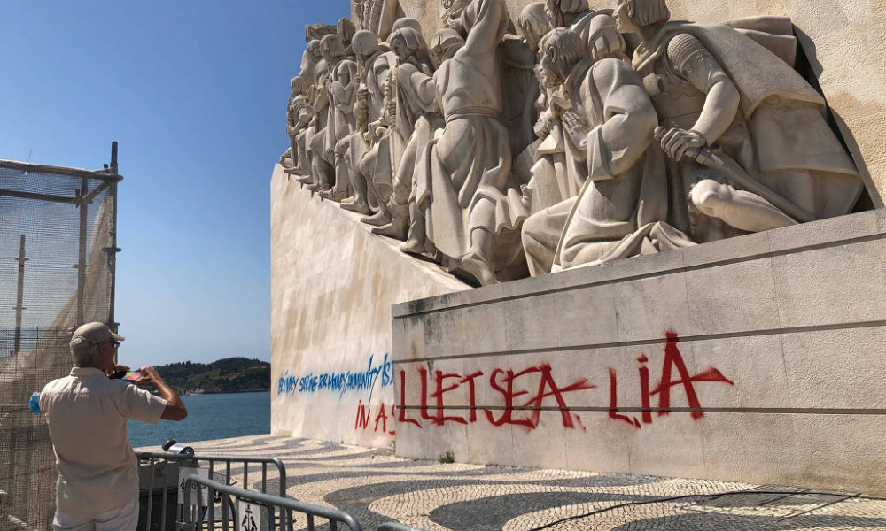Um dos principais pontos turísticos de Lisboa, o Padrão dos Descobrimentos -que exalta personagens da época das navegações e do começo da colonização portuguesa- foi vandalizado no último domingo (8). Uma das laterais do monumento foi pichada com inscrições em inglês com erros ortográficos que dizem: “Velejando cegamente por dinheiro, a humanidade está se afogando em um mar escarlate”.