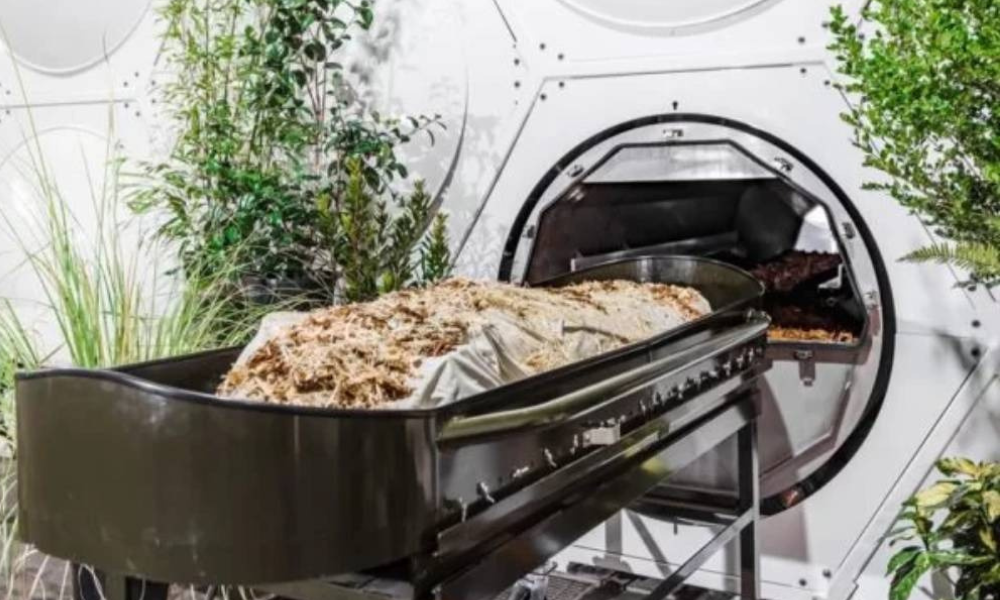 O processo é assim: o corpo da pessoa é colocado em um recipiente reutilizável acompanhado de material vegetal como lascas de madeira, sementes de alfafa e palha. A mistura orgânica cria o habitat perfeito para que os micróbios se desenvolvam naturalmente e façam o trabalho, decompondo o corpo de forma rápida e eficiente em aproximadamente um mês.
