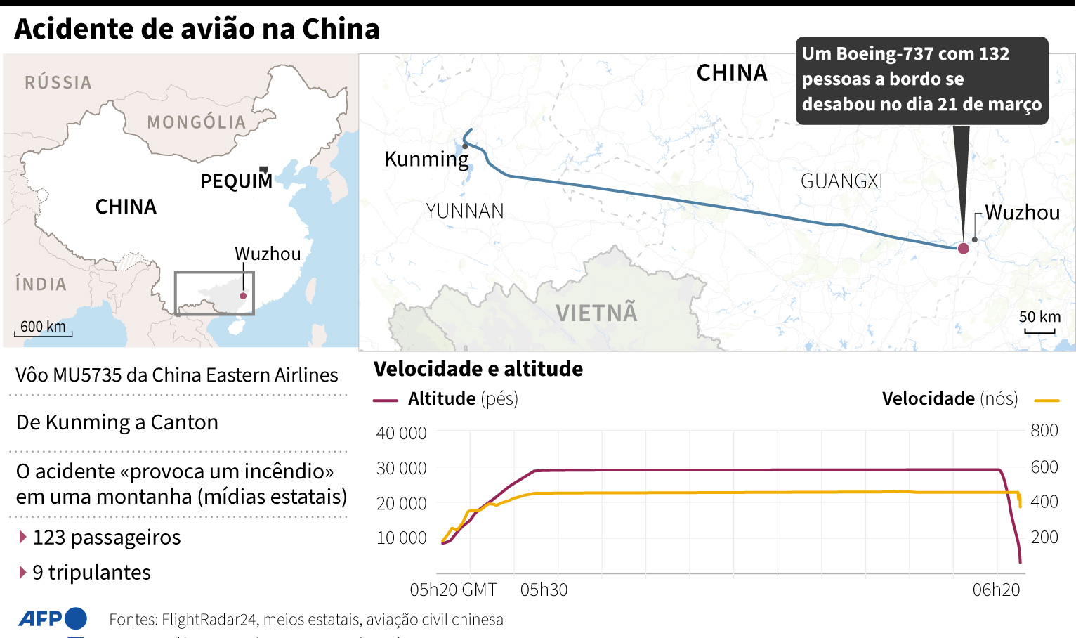 O Boeing 737 da companhia China Eastern Airlines viajava da cidade de Kunming para a metrópole de Guangzhou, mas “perdeu o contato quando estava sobrevoando a cidade de Wuzhou”, na região montanhosa de Guangxi, segundo um comunicado da Administração Chinesa da Aviação Civil (CAAC).