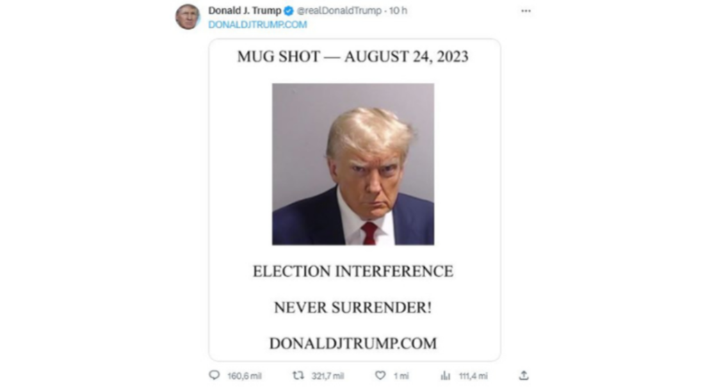 O ex-presidente dos Estados Unidos Donald Trump voltou a publicar uma mensagem no X (ex-Twitter), após ter abandonado a plataforma em janeiro de 2021. Ele divulgou a foto tirada besta quinta-feira, 24, em seu fichamento em uma prisão no condado de Fulton, quando pagou US$ 1 milhão de fiança para ficar livre, durante a investigação de manipulação nas últimas eleições presidenciais que ocorre na Geórgia.