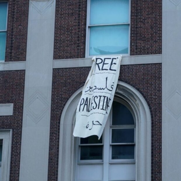 Uma bandeira com os dizeres “Palestina Livre” foi pendurada em uma das janelas da instituição, que restringiu fortemente o acesso ao campus, onde havia hoje uma pequena presença policial.