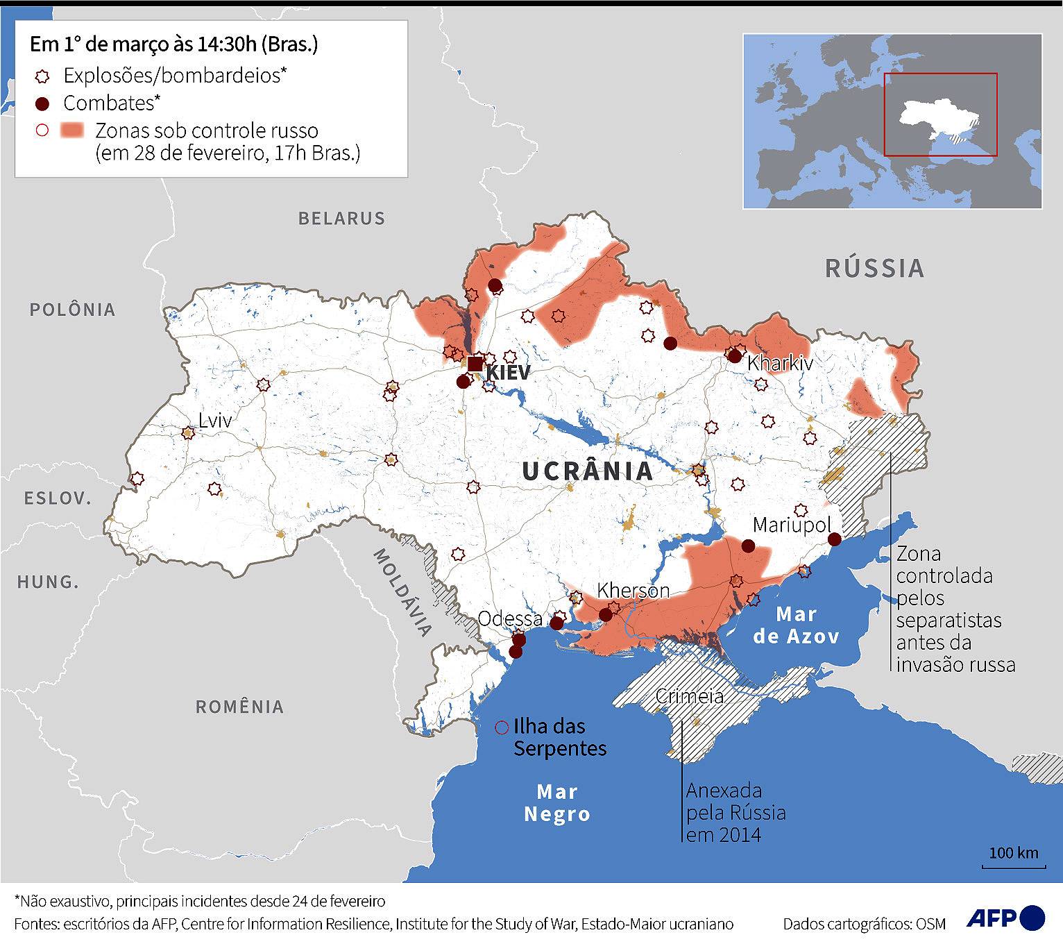 O presidente da Ucrânia também ressaltou que a comunidade internacional “chegou tarde demais” em apoio aos ucranianos. Segundo ele, não há armas suficientes para evitar a captura da capital, Kiev. “A Rússia não está interessada na paz. Está interessada em um banho de sangue”, acusou.