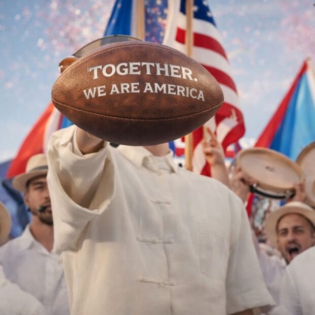 No encerramento, a bola de futebol americano com a frase “Together, We Are America” fez o gesto final. América não como país, mas como continente. Um deslocamento sem agressividade. Um redesenho de fronteiras feito por símbolo, não por ataque. Inclusão sem grito.