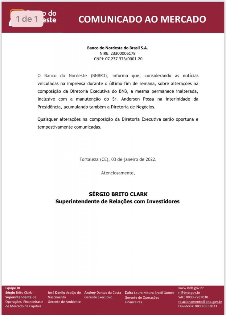 O diretor de Negócios do banco, Anderson Possa, segundo o comunicado, vai acumular a Presidência do Banco do Nordeste. Conforme já vinha fazendo antes da matéria ser publicada.