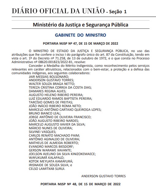 Segundo publicação feita no Diário Oficial nesta quarta, a medalha foi concedida “como reconhecimento pelos serviços relevantes em caráter altruísticos, relacionados com o bem-estar, a proteção e a defesa das comunidades indígenas”.