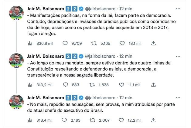 Bolsonaro lamentou a depredação causada pelos bolsonaristas. “Manifestações pacíficas na forma da lei fazem parte da democracia. Contudo, depredações e invasões de prédios públicos como ocorrido no dia de hoje, assim como os praticados pela esquerda em 2013 e 2017, fogem à regra”, escreveu, no Twitter.