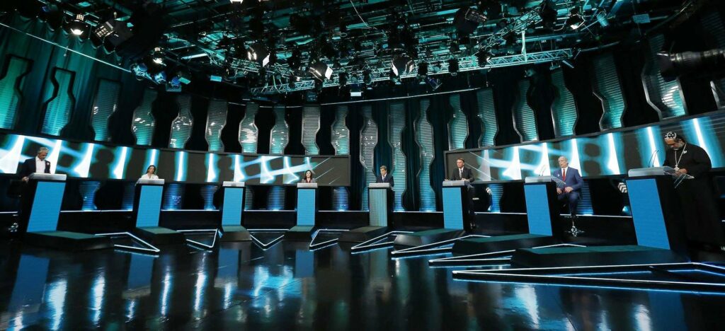O debate deste sábado (24) foi organizado em pool por SBT, CNN Brasil, O Estado de S. Paulo, Terra, Veja e as rádios Eldorado e Nova Brasil.