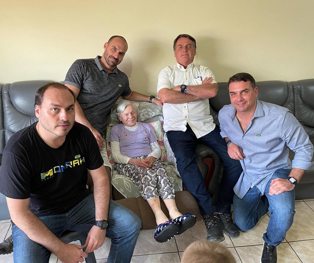 O presidente Jair Bolsonaro (sem partido) foi visitar a mãe, de 94 anos, junto aos filhos. Tanto os políticos quanto a idosa não usavam máscara no momento da foto publicada pelo senador Flávio Bolsonaro (Patriota-RJ).
