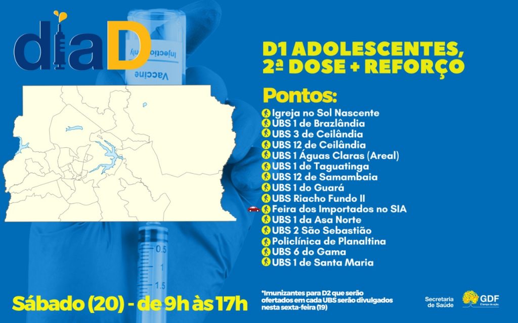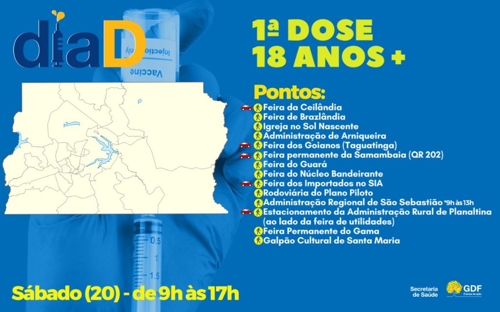O Distrito Federal segue os passos do Ministério para promover, no sábado (20), um Dia D de vacinação. O objetivo é o mesmo: aplicar primeiras e segundas doses em quem ainda falta tomar. A Secretaria de Saúde vai instalar postos em locais de grande movimentação, como feiras, administrações e a Rodoviária do Plano Piloto. Veja as listas: